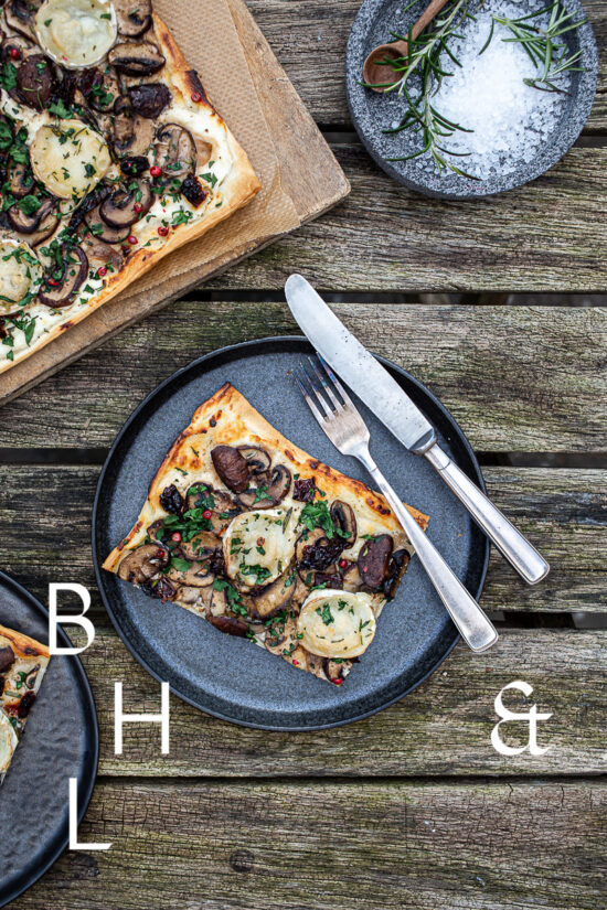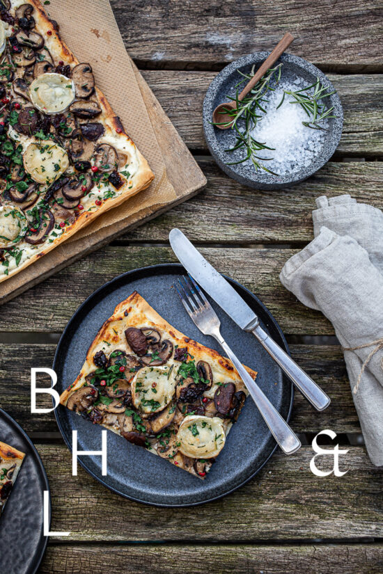 Food photography with lemons and lemon leaves on a black plate set on a black table, shot from above