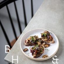 Food photography of a fresh baked sourdough bread with fried mushrooms
